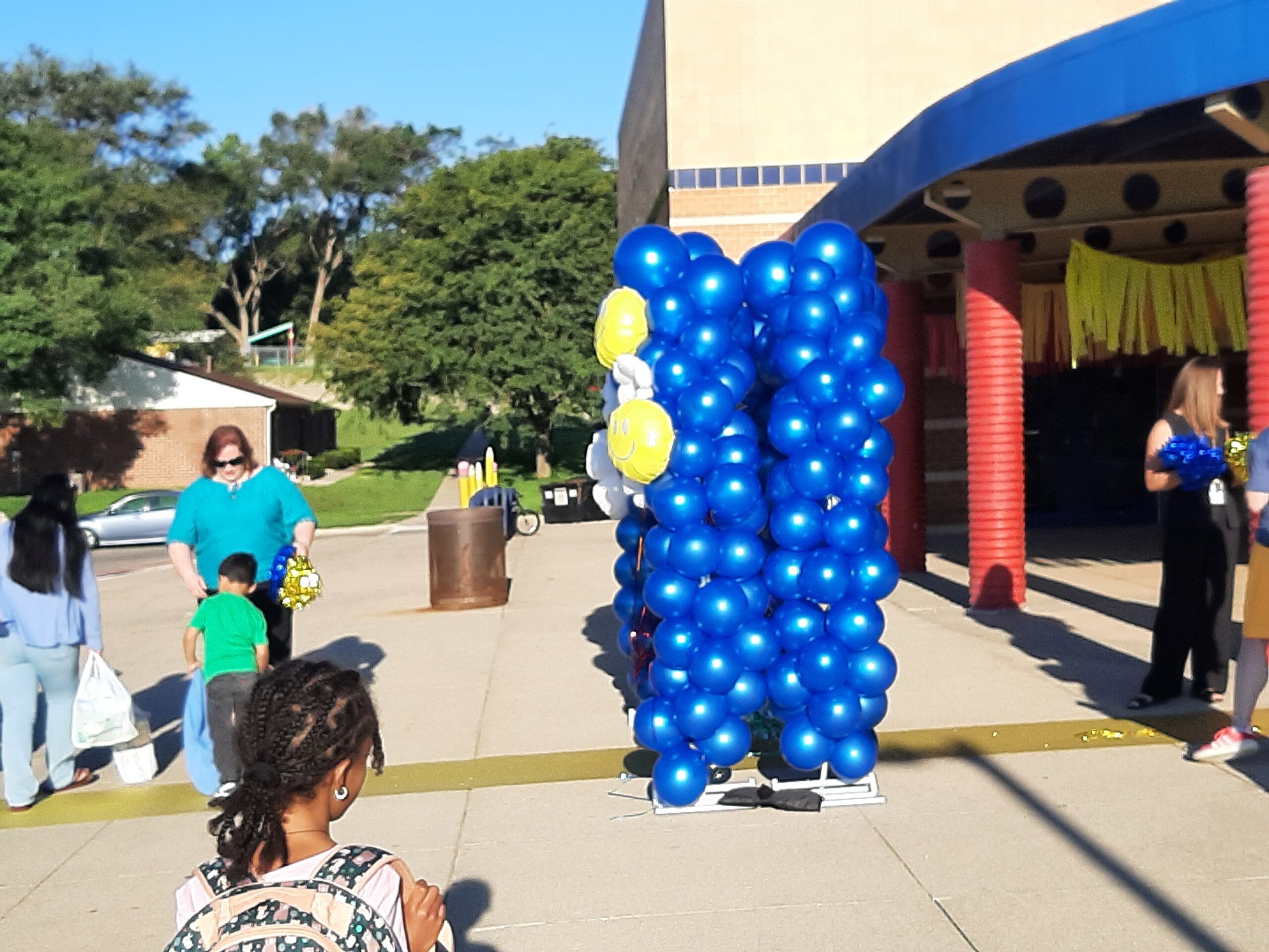 BEMUS SAYS THE SCHOOL WENT ALL OUT TO WELCOME STUDENTS BACK WITH A BALLOON ARCH TO HAVE THEIR PICTURE TAKEN UNDER, MUSIC, AND CHEERING TEACHERS WITH POM POMS: