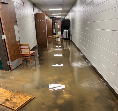 PHOTOS CIRCULATING ON SOCIAL MEDIA FROM KINGSLEY-AREA RESIDENTS AND PARENTS SHOW SUBSTANTIAL FLOODING AND WATER DAMAGE IN A BAND CLASSROOM, A COMMONS SPACE, AND HALLWAYS.