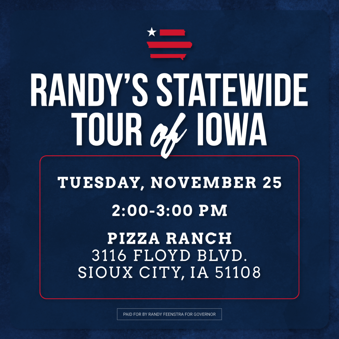 FEENSTRA , WHO CURRENTLY SERVES AS IOWA’S 4TH DISTRICT CONGRESSMAN, WILL HOLD A PUBLIC MEET AND GREET EVENT AT THE PIZZA RANCH ON 3116 FLOYD BOULEVARD AT 2PM.