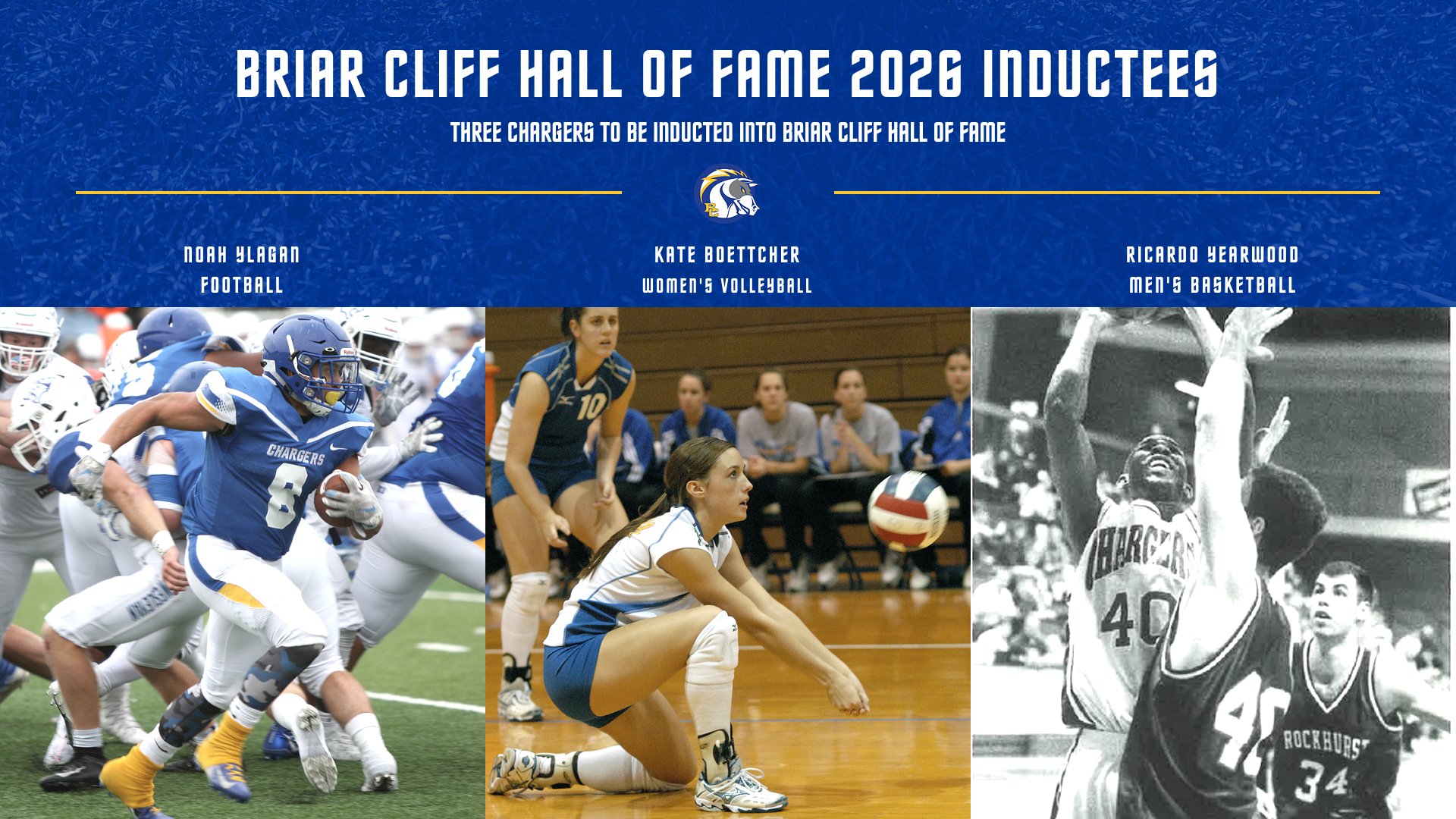 (Sioux City, Iowa – 12/16/2025) Briar Cliff Athletics is proud to announce its 2026 Hall of Fame class and will induct three Chargers on January 17. The Hall of Fame class includes Noah Ylagan (football), Kate Boettcher (women’s volleyball) and Ricardo Yearwood (men’s basketball).