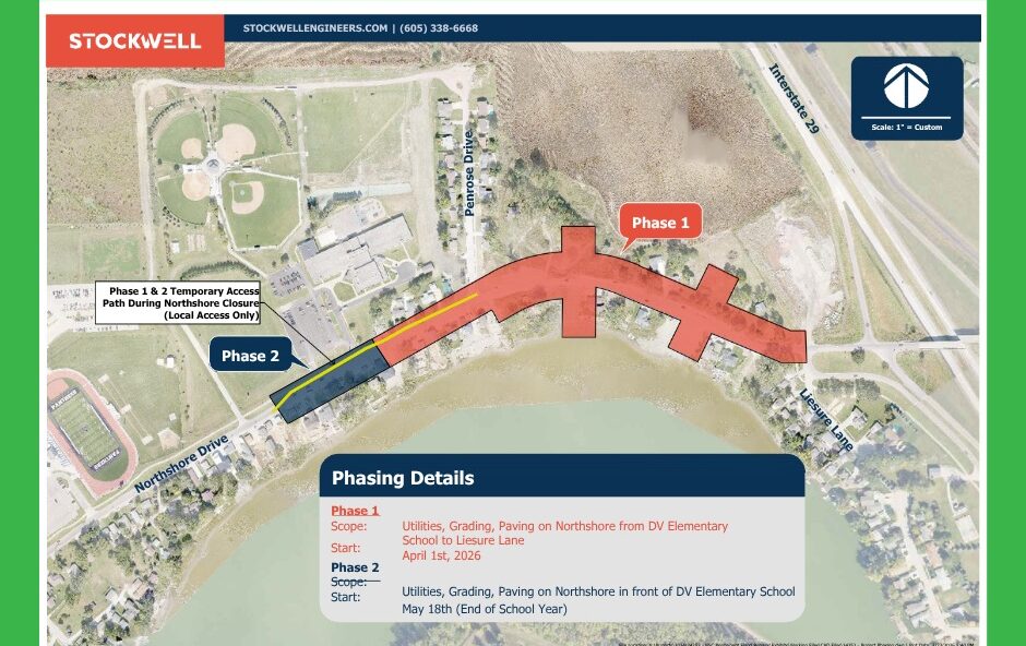 MORE CONSTRUCTION WILL TAKE PLACE SOON ON NORTHSHORE DRIVE IN NORTH SIOUX CITY THAT WILL AFFECT ACCESS TO DAKOTA VALLEY SCHOOL BUILDINGS AND FACILITIES.