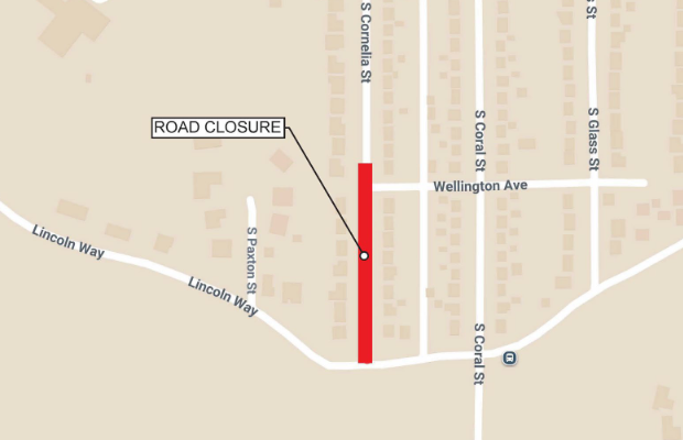 WHILE THIS WORK IS UNDERWAY, SOUTH CORNELIA STREET WILL BE CLOSED TO THROUGH TRAFFIC FROM LINCOLN WAY TO JUST NORTH OF WELLINGTON AVENUE.